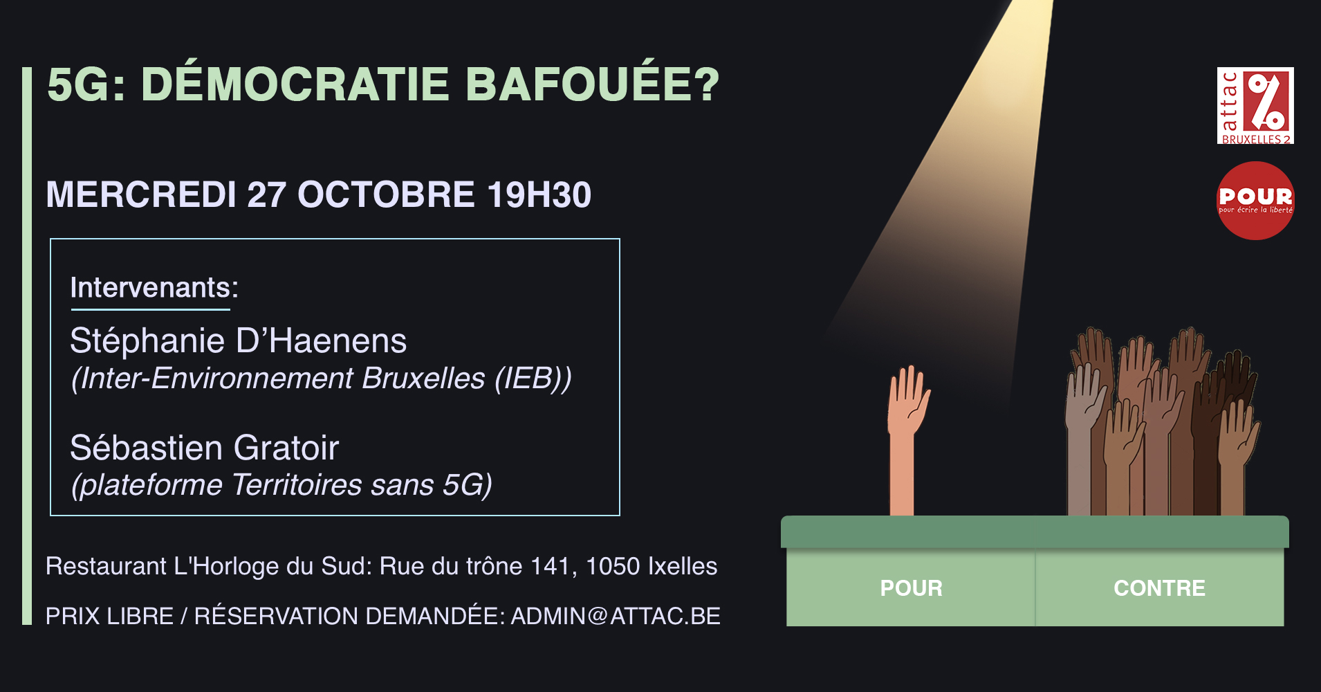 Pour mieux comprendre les enjeux démocratiques que pose la mise en place de la 5G en Belgique et, plus largement, les questions soulevées par cette nouvelle technologie, Attac Bruxelles et le journal POUR vous invitent à en débattre avec :