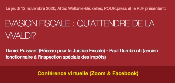 Attac Wallonie-Bruxelles, POUR.press et le Réseau pour la Justice Fiscale (RJF) vous proposent de débattre, entre autres, de ces questions lors d’une conférence en ligne retransmise en direct sur Zoom et Facebook, avec avec deux fonctionnaires retraités de l’administration fiscale :